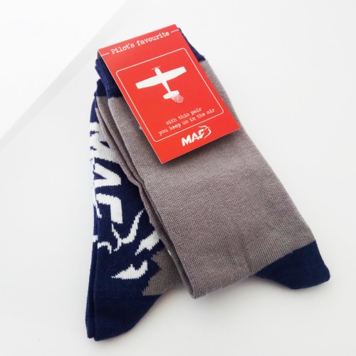De maffe sokken zijn gemaakt van 95% katoen en 5% elastaan en zijn beschikbaar in meerdere ontwerpen en maten. Bestellingen worden binnen drie werkdagen verwerkt. Met de aankoop van deze sokken steun je het werk van MAF.